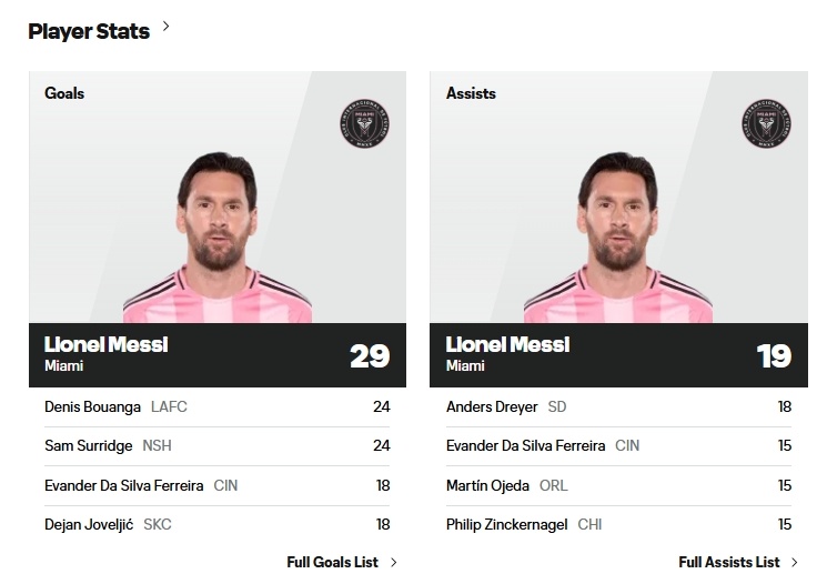 好意思职联官方统计助攻榜方面,梅西19助,与圣地亚哥球员德雷尔捏平,并排第一。
