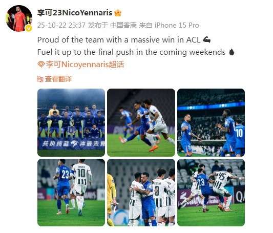 10月23日讯 亚冠精英第3轮比赛,申花主场2-0打败首尔FC,得回新赛季亚冠首胜。赛后,李可在社媒庆祝了这场获胜。