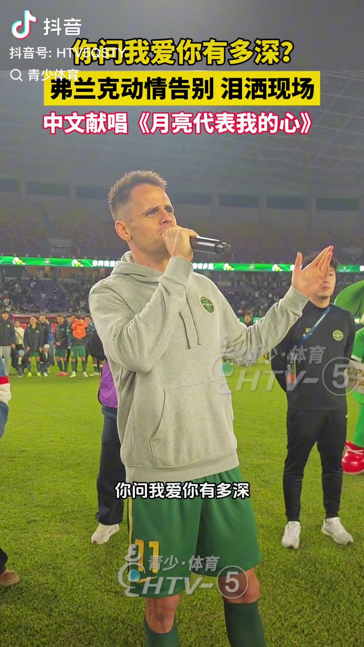 据“青少体育”报说念,弗兰克在告别庆典上用汉文深情献唱《月亮代表我的心》,情到深处时动情落泪。告别庆典上,浙江队高层也向他奉上了一件印有弗兰克名字和数字140字样的追念球衣。
