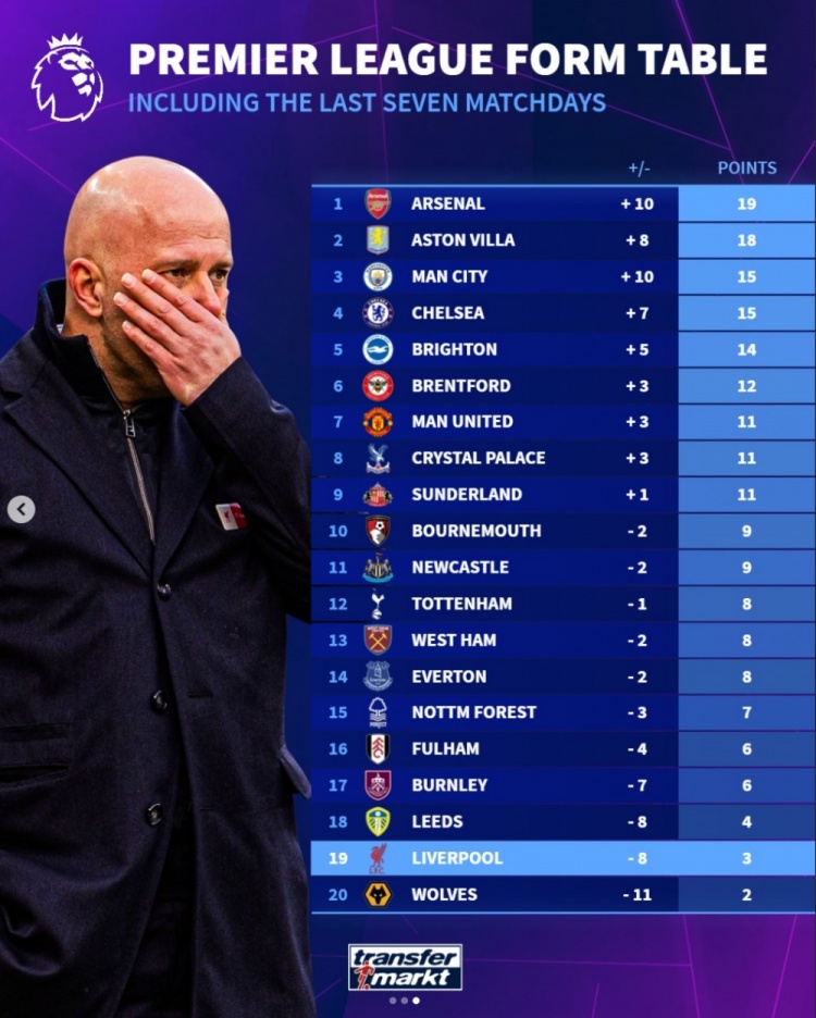 11月27日讯 德转列英超各队最近7轮联赛得分,阿森纳19分居首,维拉、曼城列二三位。利物浦仅高于狼队,排在倒数第二。