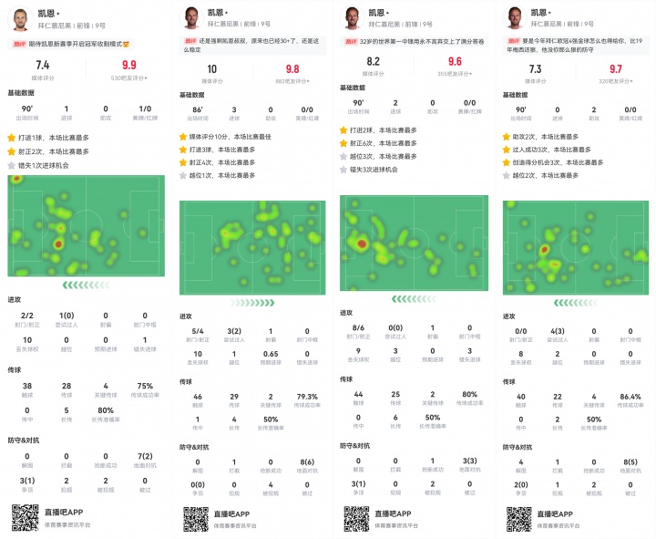 新赛季开赛拜仁前4场比赛,凯恩一齐首发出场,孝顺6球2助攻。从球员的行径热区图上看凯恩险些遮蔽全场,以致是回防到了己方禁区。