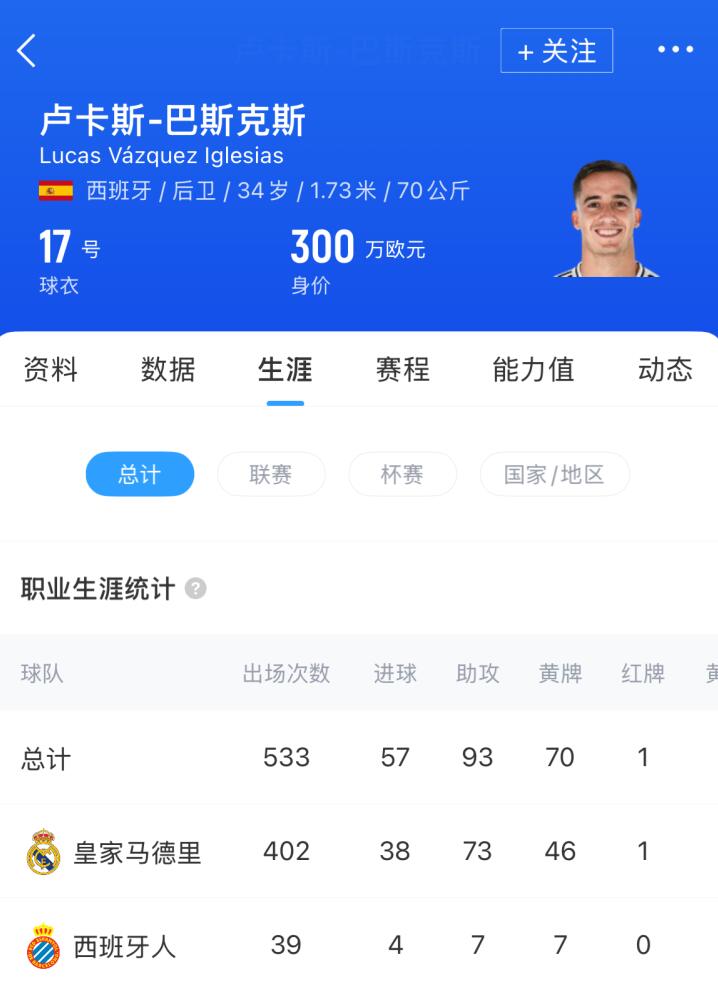 身高1.73米的巴斯克斯在2024/25赛季为皇马施展了关键作用,他代表球队出战53场发达比赛,其中32场为西甲,10场为欧冠。这位球员探讨为皇马出场402次,行状糊口共夺得23个冠军。