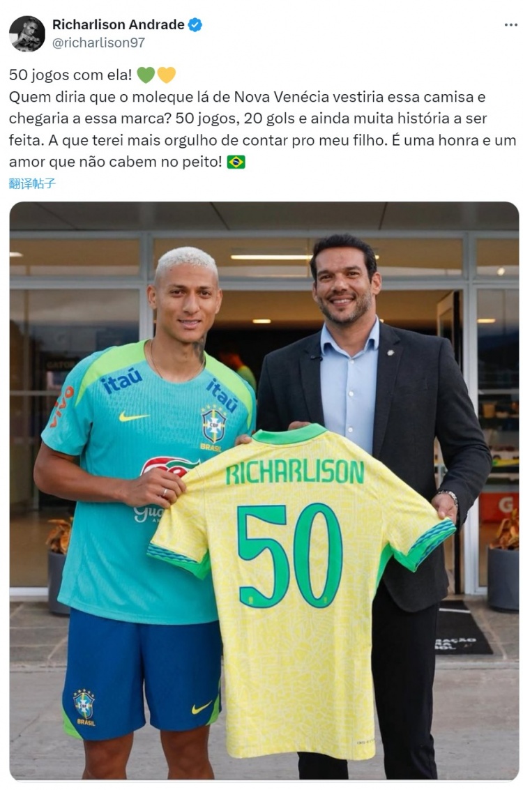 理查利森晒出与操心球衣的合照,配文:“为国度队出战50场比赛!💚💛谁能念念到阿谁来改过维尼西亚的孩子会穿上这件球衣,并达到这一里程碑?”