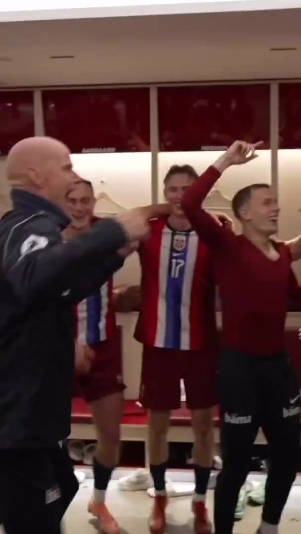 10月12日讯 本轮世初赛挪威5-0狂胜以色列,最快下轮可锁定全国杯正赛门票,赛后挪威全队在更衣室神圣庆祝,受伤的队长厄德高只可坐在座位上和队友通盘嗨。