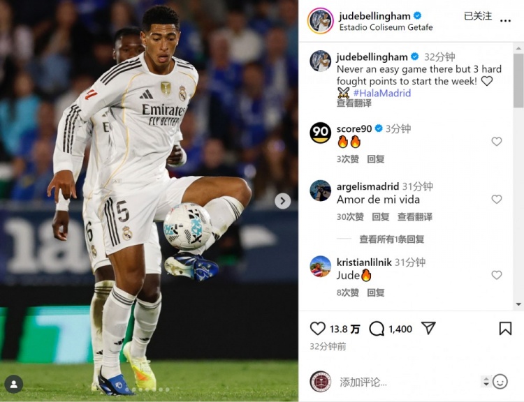 贝林厄姆社媒晒出比赛像片,配文:“在这里比赛从来齐不叮属,但以一场鏖战拿下三分,开启新的一周。”