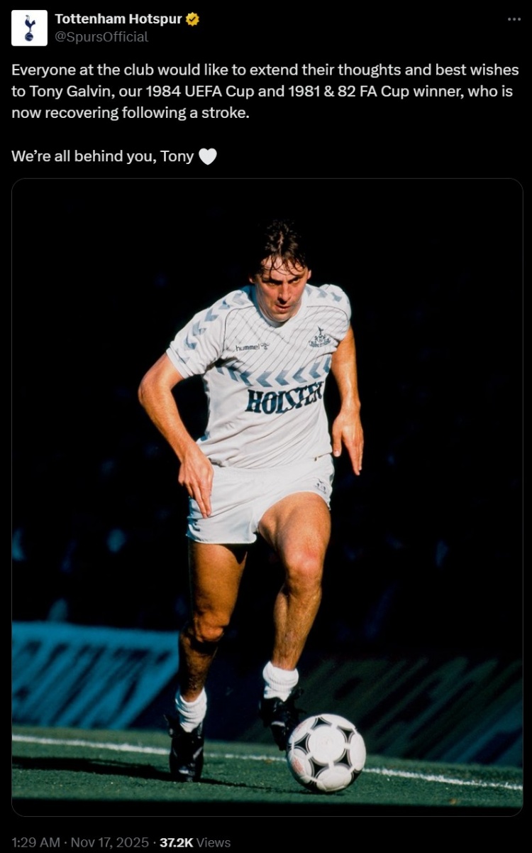 热刺官方社媒写说念:“俱乐部整体成员向托尼·加尔文致以慰问并奉上好意思好的祝愿,他是俱乐部在1984年取得欧洲定约杯冠军、1981、1982年取得足总杯冠军的成员,现在他正处于中风后的康复期。咱们齐相沿你,托尼🤍”