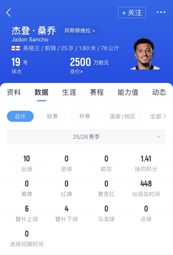 今夏租出维拉于今,25岁的桑乔各项赛事出场10次,0球0助处境烦嚣。此前据《邮报》的报说念,桑乔租出时辰,维拉需承担其25万英镑周薪的80%(即20万镑)。