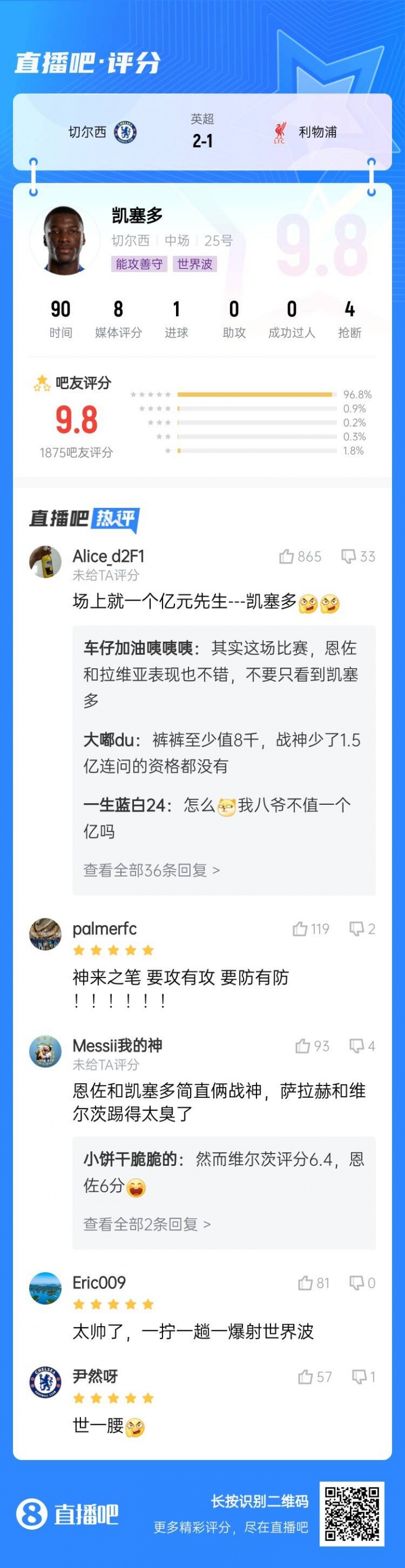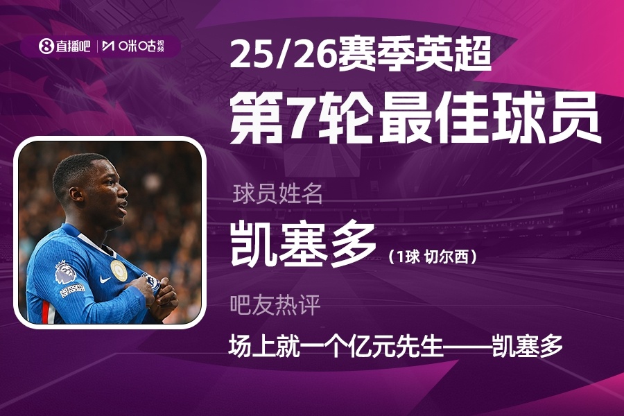 2025-2026赛季英超火热进行中,和咪咕体育聚首发起每轮英超最好球员评比步履!第7轮评比遵守出炉,切尔西后腰凯塞多攻防兼备,轰入宇宙波匡助切尔西2-1战得胜物浦,取得吧友5.6万票的赈济,当选 【X咪咕体育英超第7轮最好球员】!