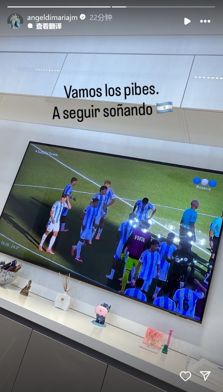 迪马利亚通过电视不雅看了阿根廷U20的比赛,他在酬酢媒体上晒出相片,配文:“干得漂亮,小伙子们,延续追赶梦思!”