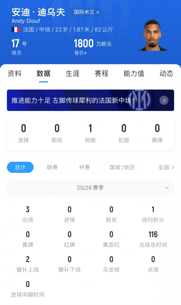 迪乌夫现年22岁,本赛季仅为国米出场3次,悉数116分钟,莫得进球和助攻,他现身价1800万欧,与国米的公约相同在2030年到期。