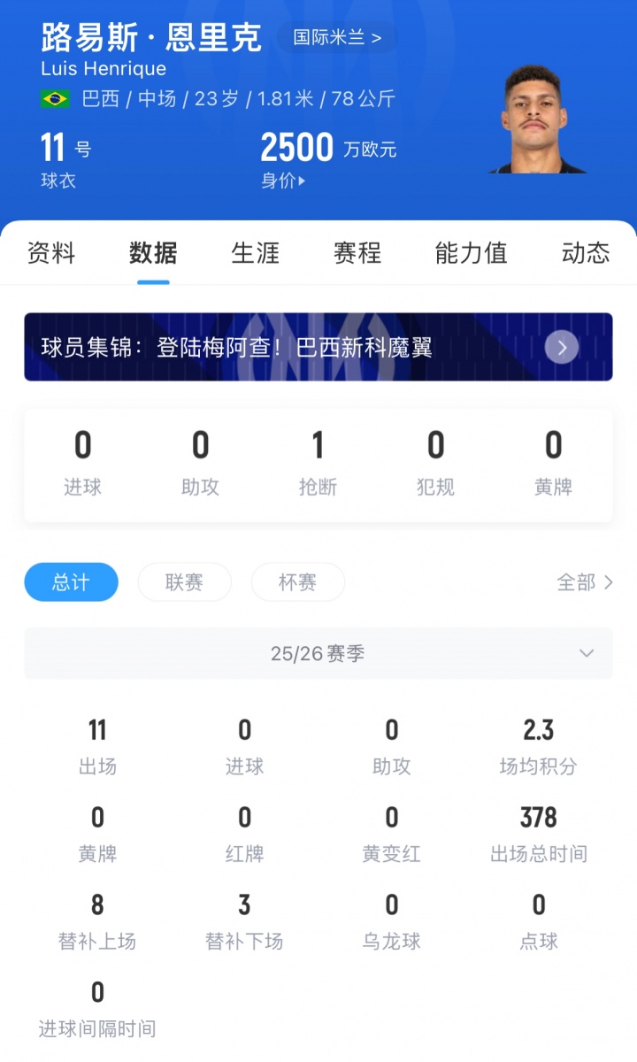 恩里克现年23岁,本赛季恩里克仅为国米登场11次悉数378分钟,莫得进球和助攻,他现身价2500万欧,与国米的公约在2030年到期。