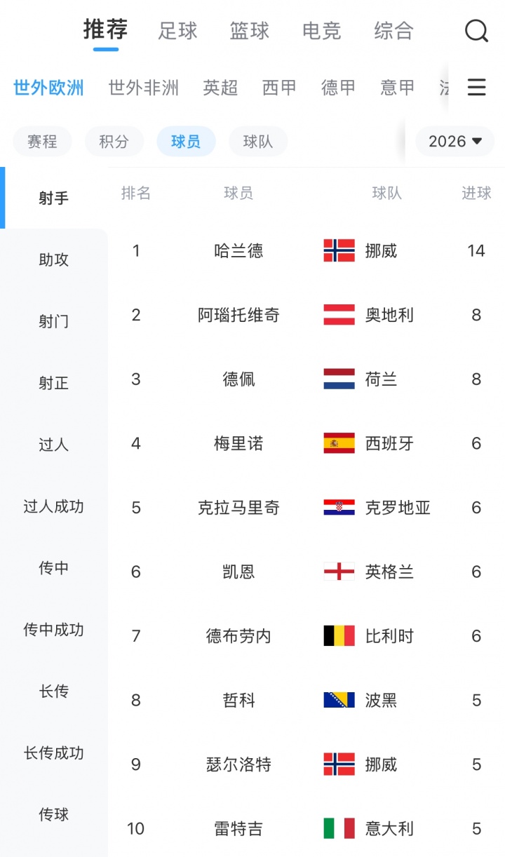 世初赛欧洲区当今的弓手榜,哈兰德14球断层领跑。他也基本详情拿下金靴。
