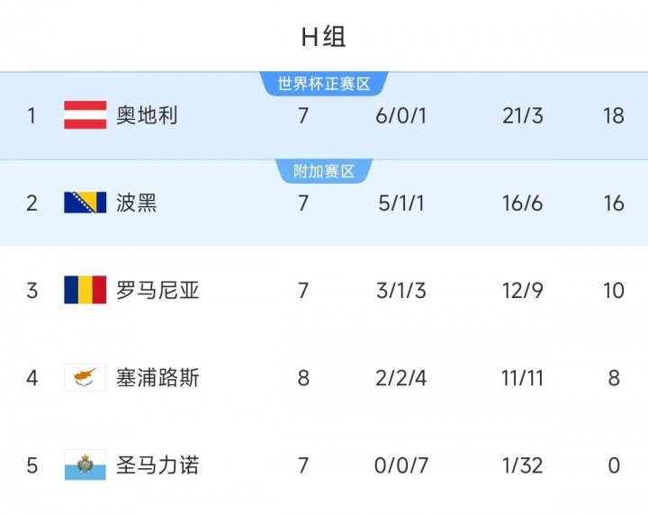 11月16日讯 世初赛欧洲区,奥地利2-0打败塞浦路斯,当今2分领跑H组。奥地利末轮对阵波黑,打平就不错径直晋级寰宇杯。