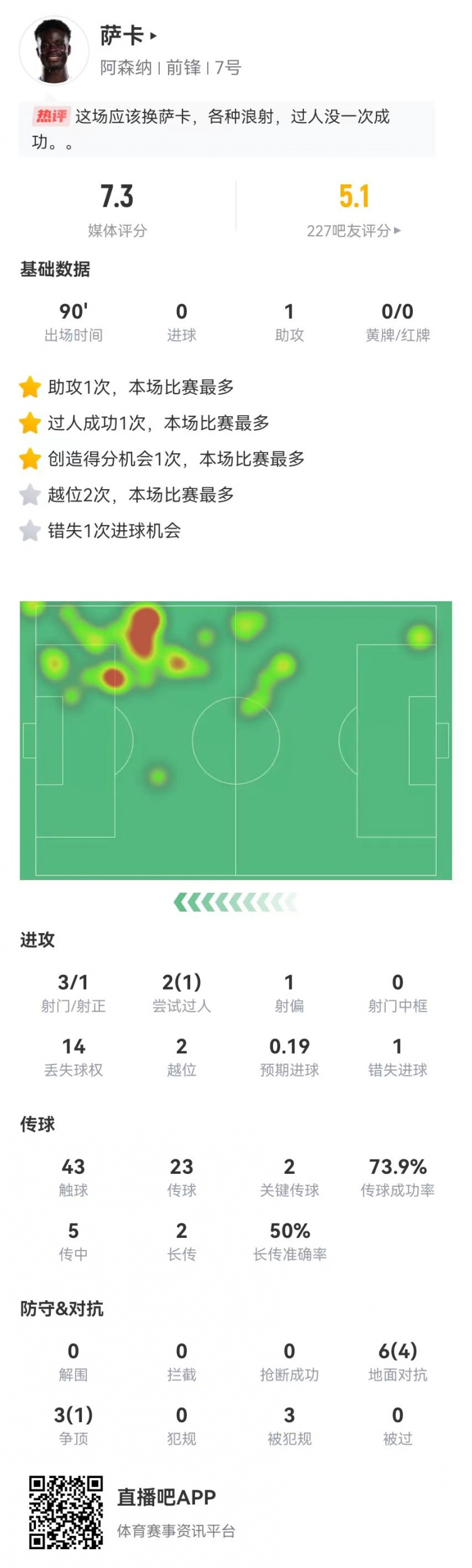 12月1日讯 阿森纳在本轮英超1-1战平切尔西,萨卡本场数据如下: