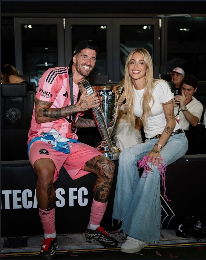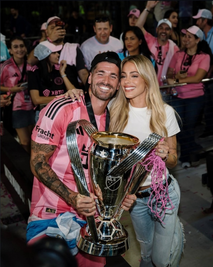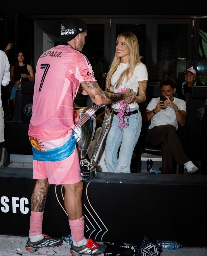 好意思职联总决赛,迈阿密海外主场3-1打败温哥华白浪,德保罗立功,斩获好意思职联总冠军!赛后,德保罗来到场边与独身妻拥抱庆祝,两东谈主与总冠军奖杯合影。
