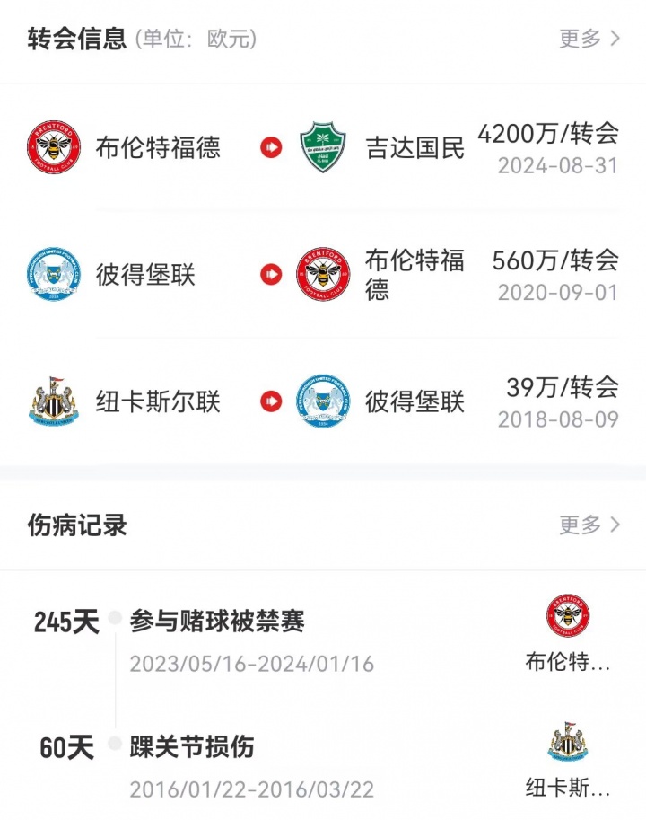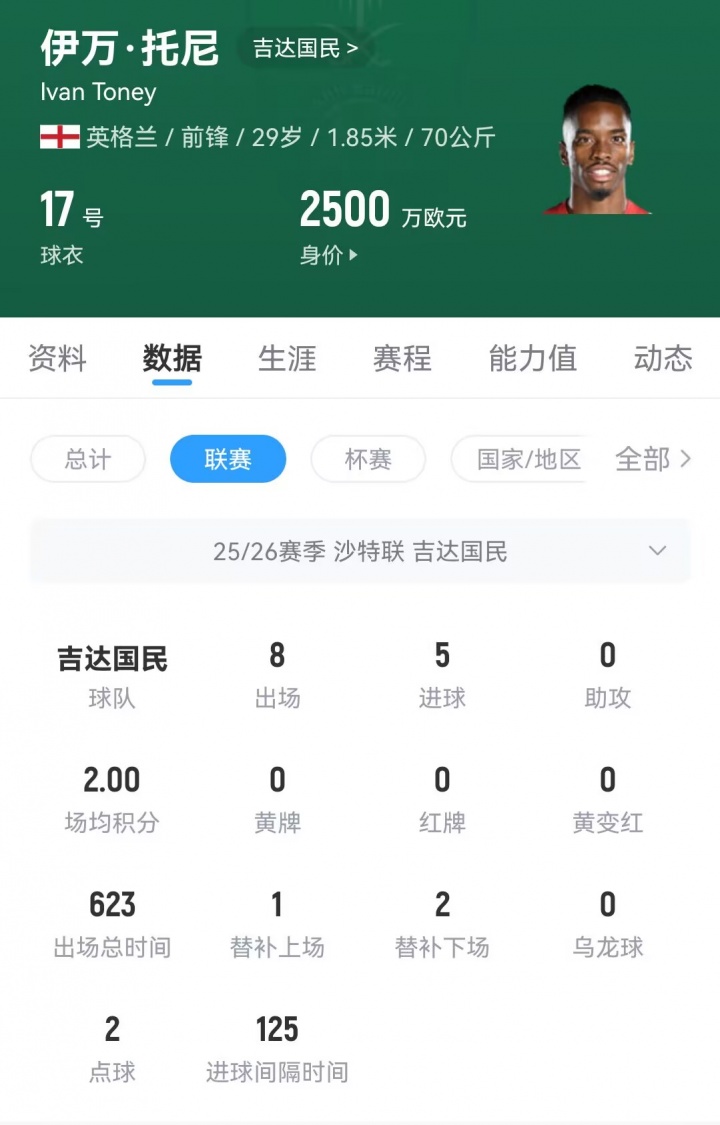 客岁夏窗伊万·托尼从布伦特福德以4200万欧元价钱转会至吉达国民,本赛季联赛出场8次孝顺5球;此前他曾因参与赌球被处以弥远禁赛。