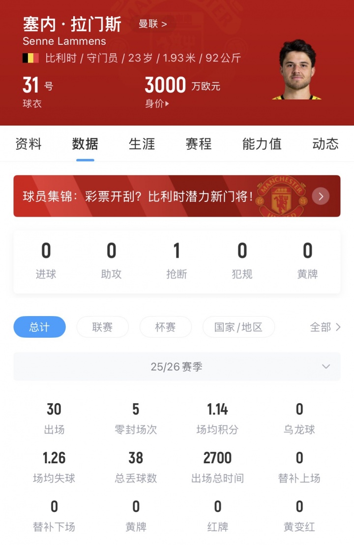拉门斯现年23岁,曼联去年夏天花费2100万欧引进,他本赛季为球队出场26次,在赛事 中屡屡贡献神扑,帮助曼联在英超稳居前五。他现身价3000万欧,与曼联的合同至2030年。