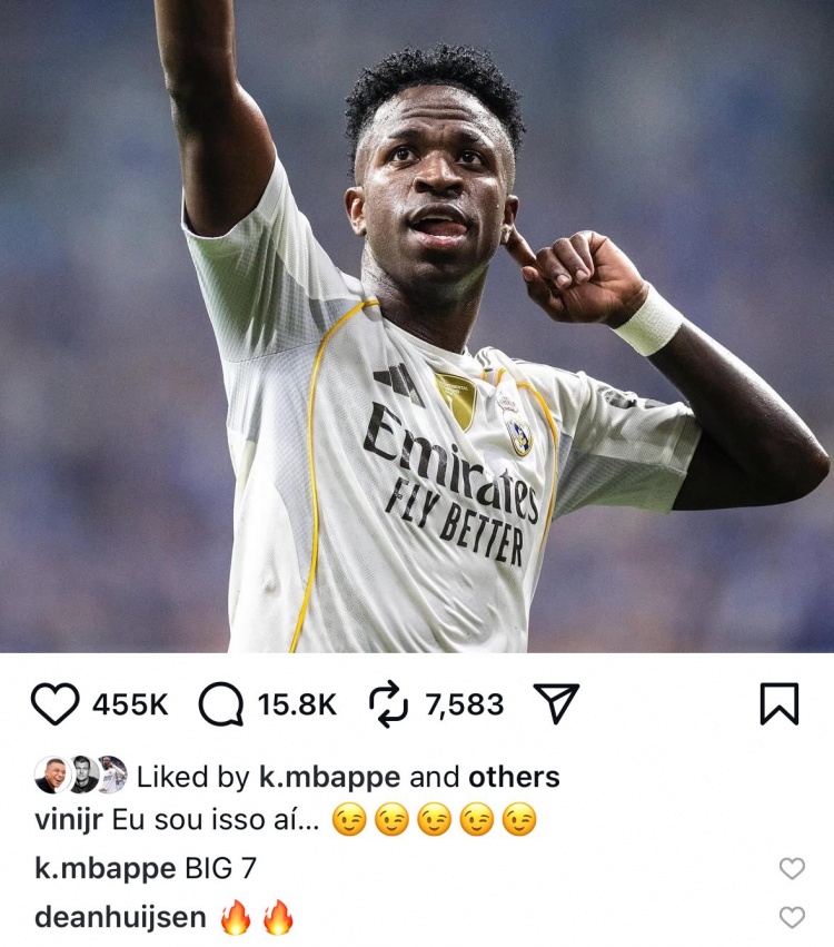 维尼修斯社媒晒出比赛相片,庆祝球队取胜,配文:“这等于我…”