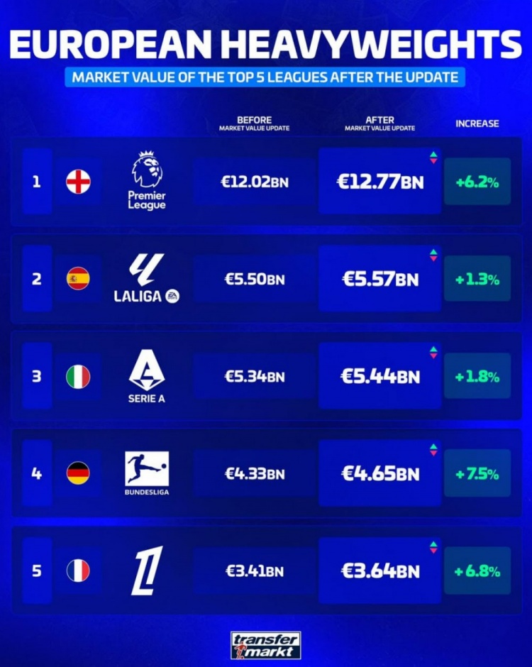 10月20日讯 德转此前更新了足坛球员身价,并盘货了五大联赛球队总身价榜,其中英超遥遥独特,以下为具体情况: