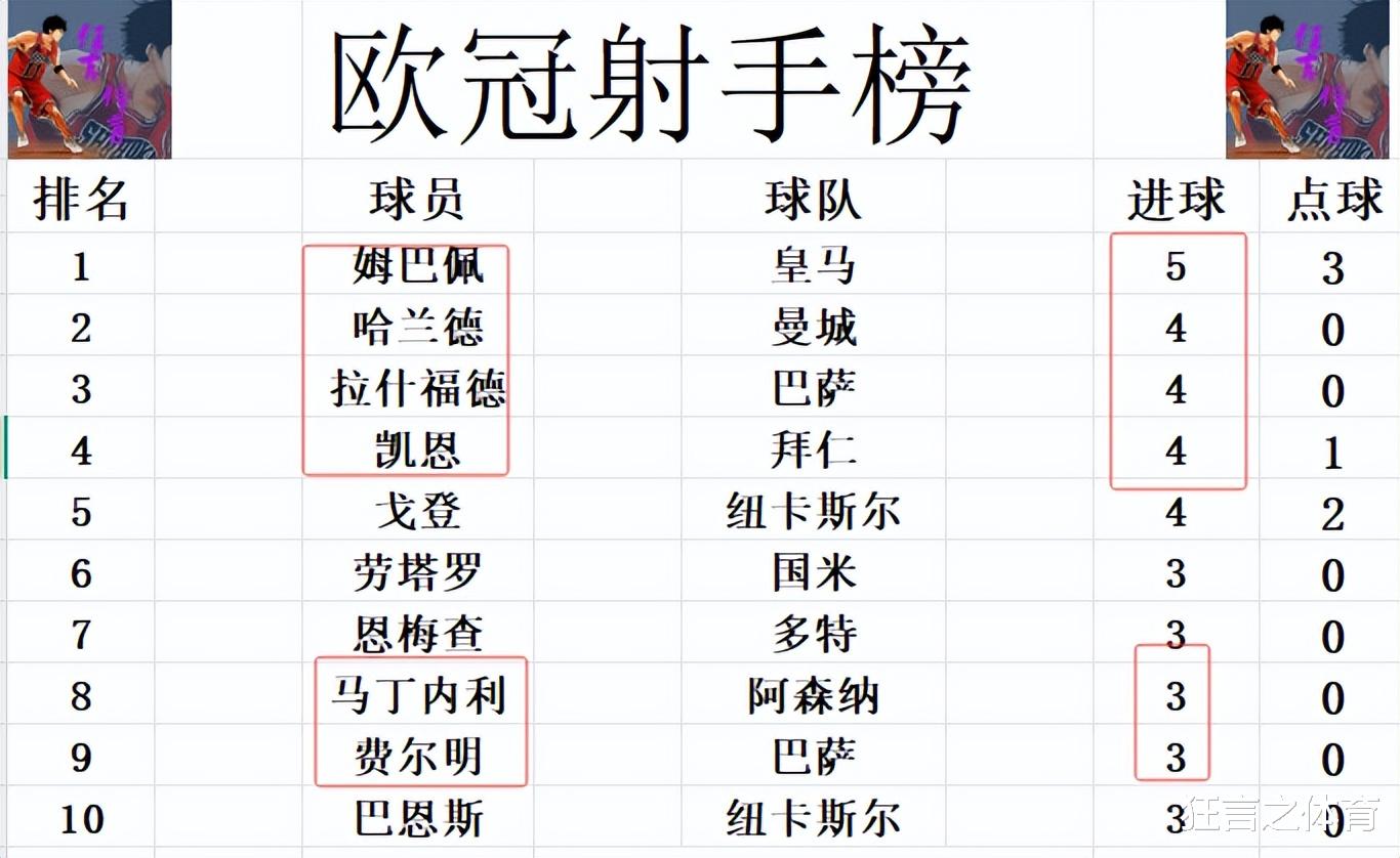 弓手榜方面,姆巴佩5球链接稳居榜首,哈兰德,戈登破门,拉什福德双响,三东说念主追上凯恩4球比肩第2。费尔明演出帽子戏法,和劳塔罗,恩梅查,马丁内利等东说念主将前十门槛提升到3球。