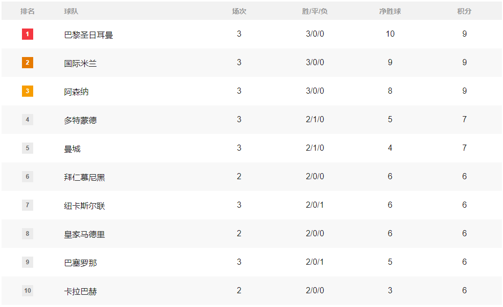 当今3战全胜的球队包括巴黎、国米、阿森纳这3支球队,他们也分列榜单的前三位。仍有契机与他们9分并驾王人驱的球队包括拜仁、皇马和大黑马卡拉巴赫。