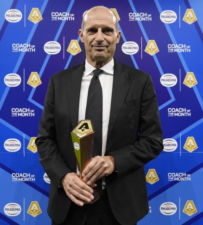 10月25日讯 意甲官方晒照,米兰主帅阿莱格里在米兰对阵比萨赛前领取了九月最好提拔奖杯。