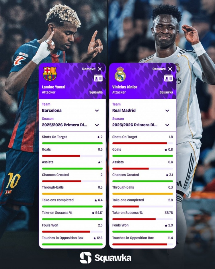 10月25日讯 皇马和巴萨将在本轮西甲焦点对决,数据机构squakwa对比了亚马尔与维尼修斯在2025/26赛季西甲要津数据(加粗项为上风数据):