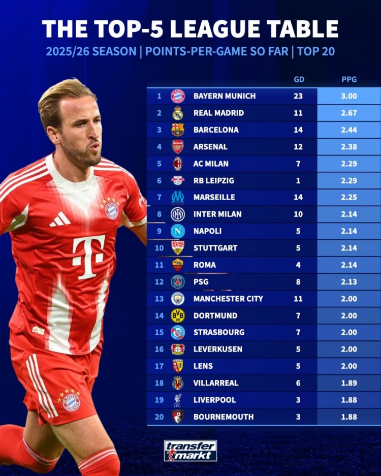 10月25日讯 《转会阛阓》统计了本赛季五大联赛球队的场均拿分情况,拜仁、皇马、巴萨、阿森纳分列前四。