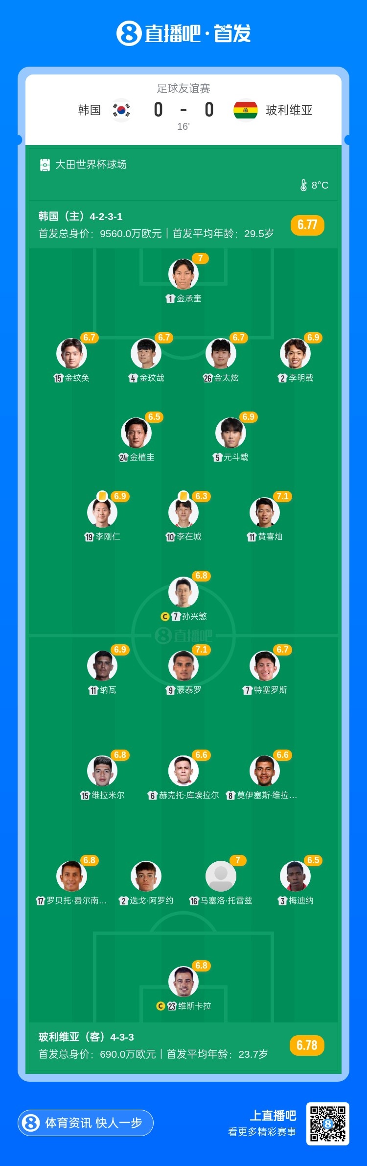 11月14日讯 北京技艺19:00,海外足球友谊赛韩国vs玻利维亚,本场比赛由马宁吹罚!上半场,金太炫矗立,蒙泰罗失良机;李在城、李刚仁染黄。半场死字,韩国暂时0-0玻利维亚。