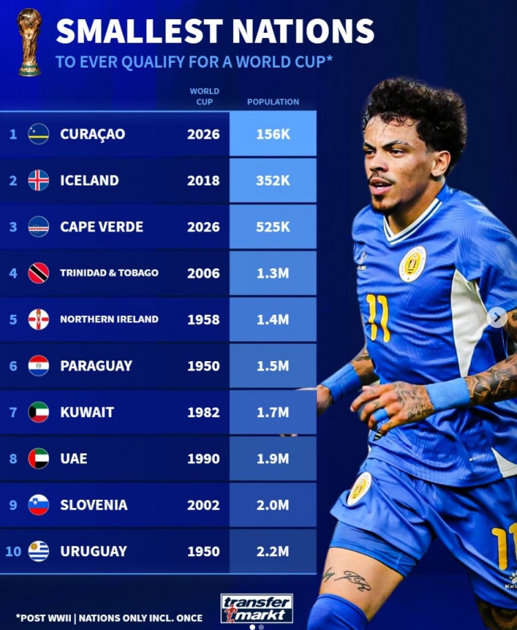 11月20日讯 世初赛刻下仅剩多个附加赛限额待定,库拉索以15.6万东谈主成为二战之后晋级寰宇杯的东谈主口最少国度,《转会市集》也统计了二战之后晋级寰宇杯东谈主口最少的国度前十。