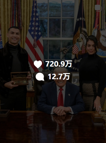 而当作酬酢媒体当之无愧的顶流东谈主物,C罗这则动态发布约2个小时后,点赞量就还是破损720万,而况仍有链接快速高涨的趋势。达洛特、马塞洛等C罗的现任、前任队友齐纷纷为这则动态点赞驳斥。此外,C罗再早些手艺与白宫官方账号共创发布的C罗携乔治娜,与特朗普在白宫中行走的视频动态发布约5小时也获得了超591万点赞量。