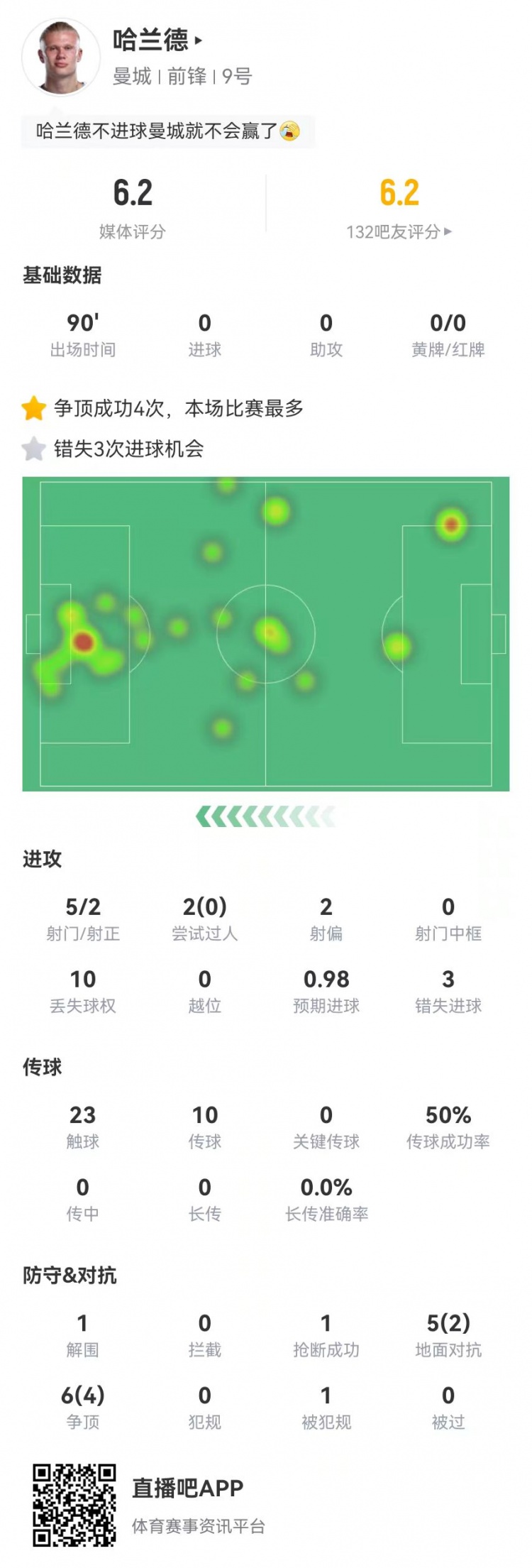 11月23日讯 曼城在本轮英超焦点战1-2不敌纽卡,哈兰德本场数据如下: