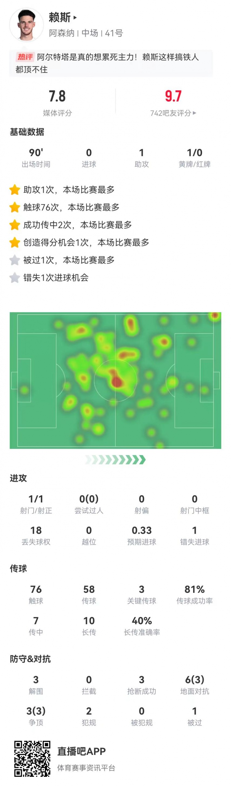 11月24日讯 阿森纳在本轮英超4-1力克热刺,赖斯本场数据如下: