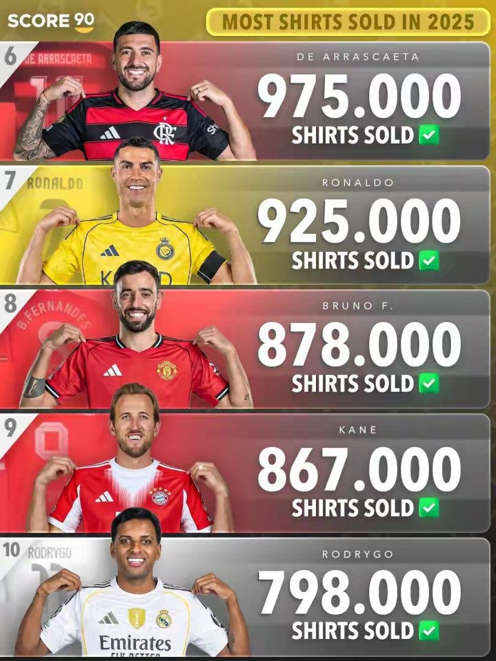 梅罗争霸是足坛不灭的话题,除了竞技层面比拼除外,经济层面的比拼亦然热点话题。那么问题来了,2025年足坛谁家球衣卖得最佳,那便是身价最高的亚马尔,梅西天然转战好意思职联,但已经高居第二,而在沙特超踢球的C罗尽然无缘前五,以致比不外巴甲球员,这如实有点让球迷感到偶而,不外望望C罗在沙特超比赛的上座率就平定了……