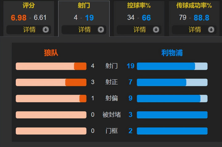 整场对决,利物浦的掌接支援的控制权率为66%,一共有19次攻踢羽毛羽排球排网框柱,其中7次正射;狼队一共有4次攻踢羽毛羽排球排网框柱,其中3次正射。