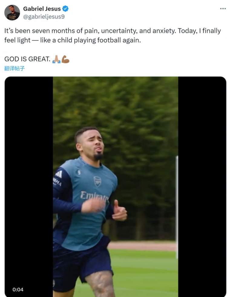 热苏斯社媒晒出西席的视频,配文:“七个月以来,我一直饱受灾祸、不细则和张惶的折磨。如今我终于感到大致了——就像一个孩子又运转踢足球了。天主是伟大的。”