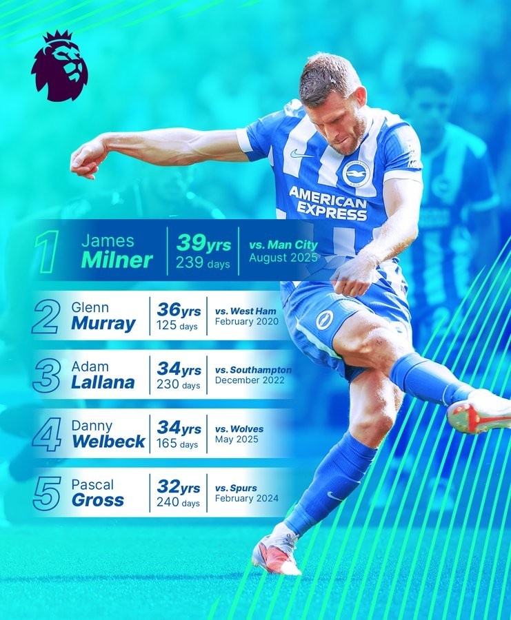 米尔纳在对阵曼城的比赛中破门,以39岁239天成为布莱顿英超最年前途球者。